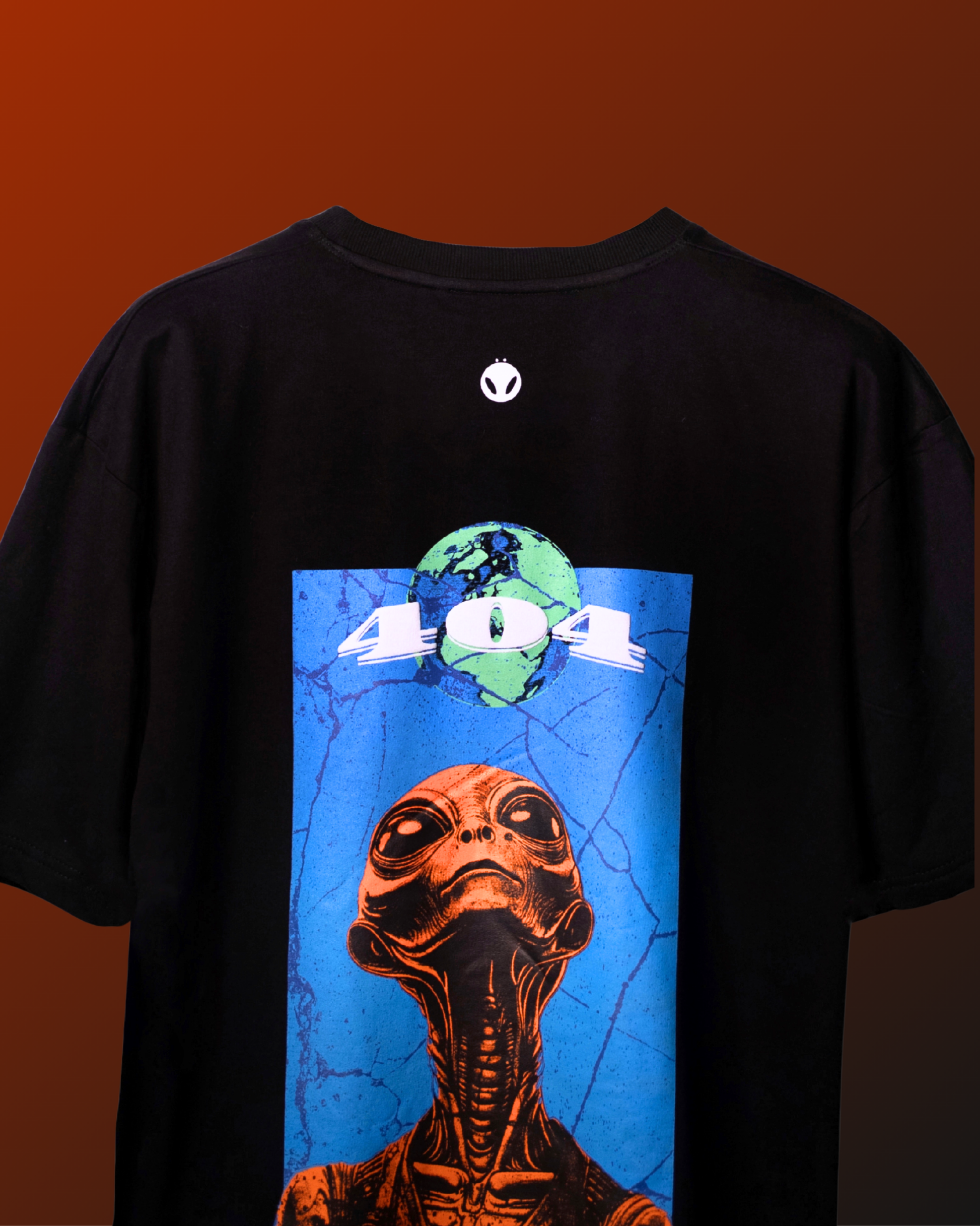 The back features a bold screen-printed graphic: an extraterrestrial figure in vivid orange, rising against a cracked blue backdrop with Earth and the 404 insignia above — a vision of rebellion beyond human limits. A minimal alien head detail rests under the neckline, amplifying the otherworldly vibe.